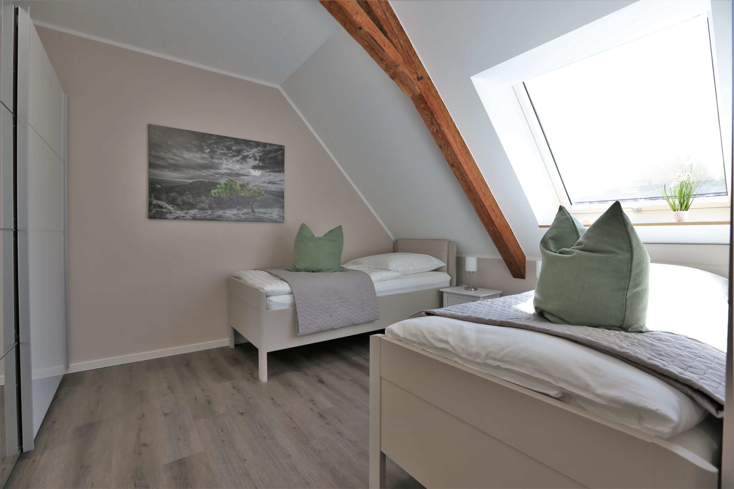 Dort befinden sich 2 einzelne Betten mit dem standarisierten Maß von 0,90 x 2,00m.