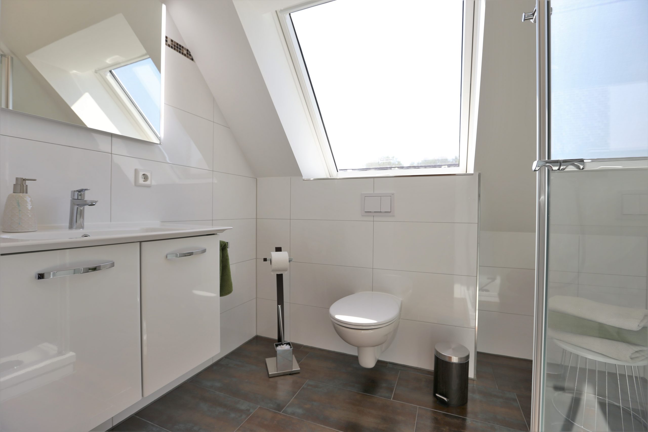 Dazu zählen eine ebenerdige Dusche mit Glastür sowie ein Waschtisch.
